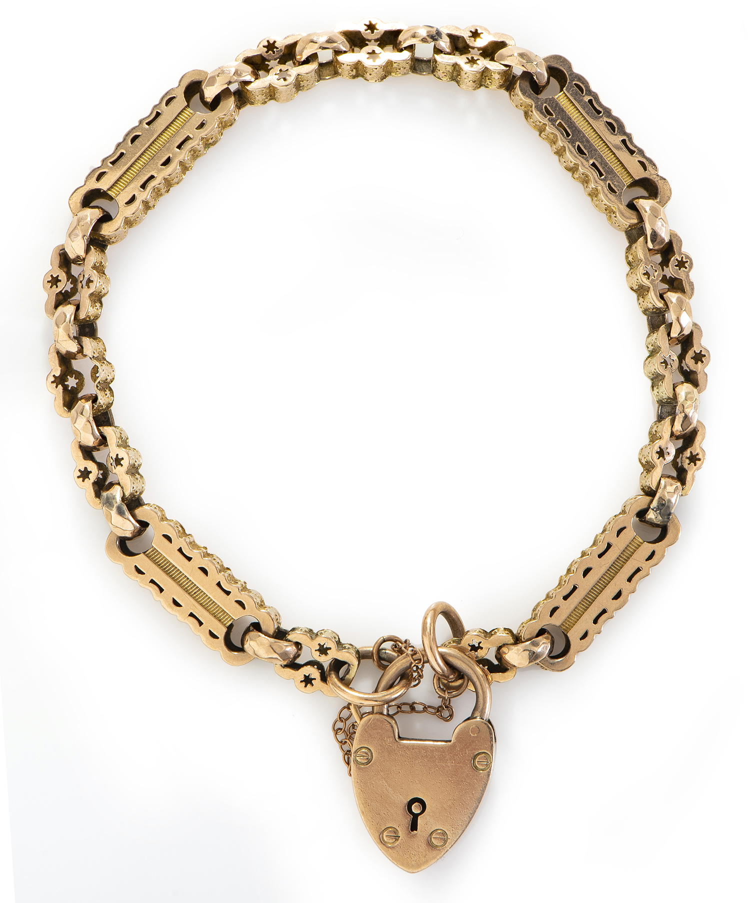 Comprising fancy pierced panel links with engraved detail to the edges and star motifs, a padlock clasp, in two tone rose and yellow gold, total length 220mm.
