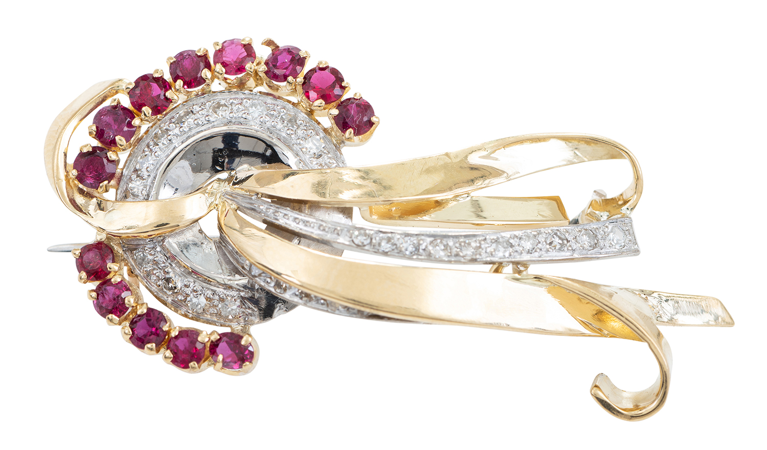 Set with rubies and diamonds in a spray design, mounted in 18ct gold.