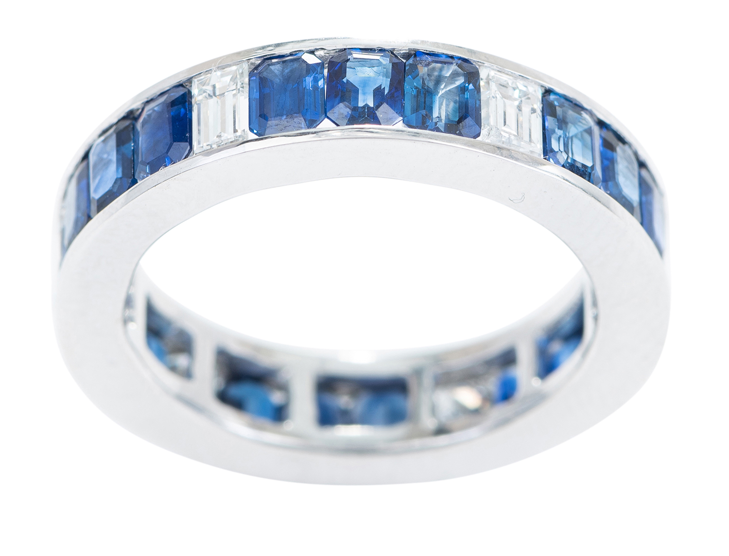 Set with square faceted sapphires totalling 5.10cts, and diamonds totalling 1.20cts, mounted in 18ct white gold, ring size P.
