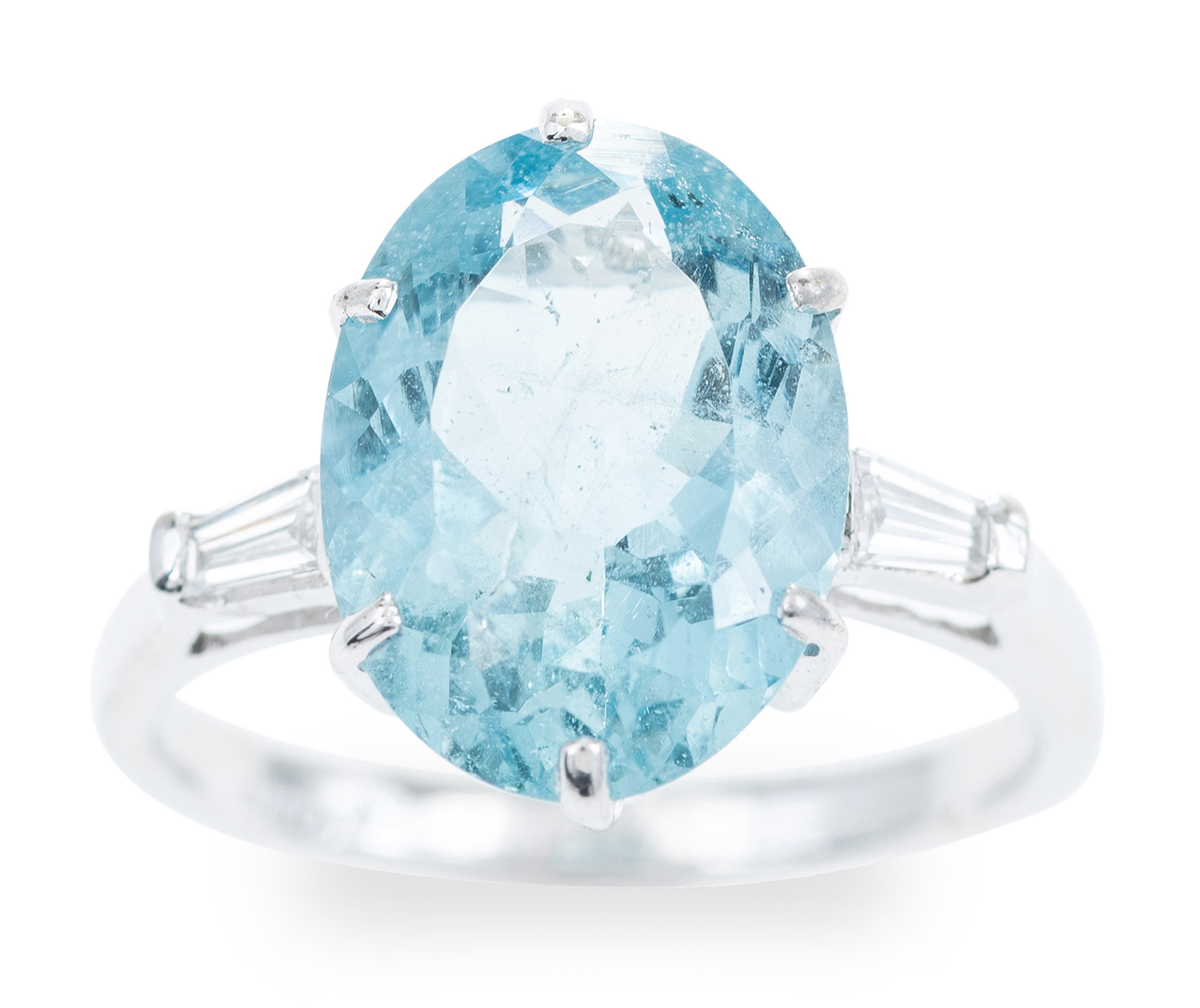 The ring presents in overall good condition. The aquamarine has inclusions including one surface reaching to the table. Light scratches to the base of the shank.