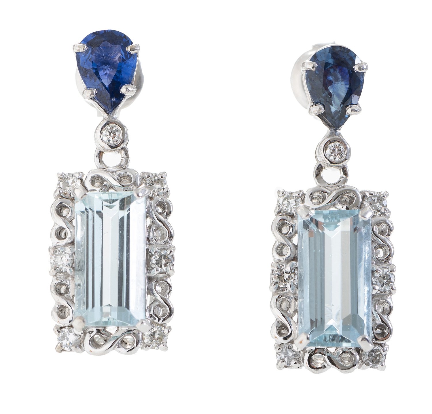 Featuring step cut aquamarines totalling 5.40cts, within a round brilliant cut diamond surround totalling 2.10cts, suspended from pear shaped sapphires totalling 0.44cts, mounted in 18ct gold.