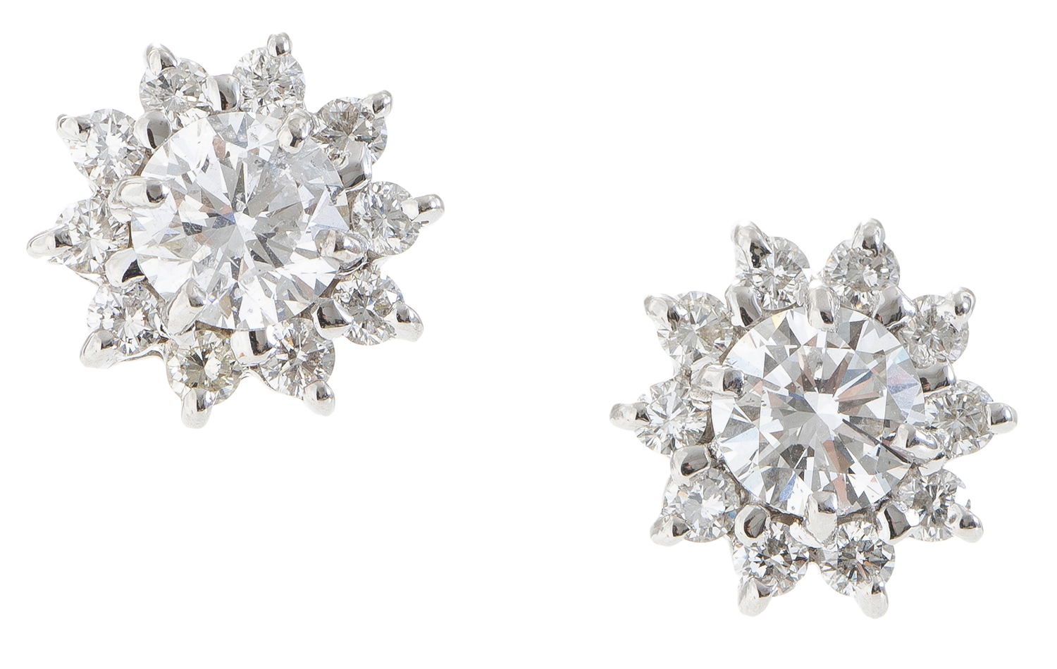 Each earring centrally set with a diamond of 1.00cts, within a diamond surround totalling 0.40cts, mounted in 18ct white gold.
