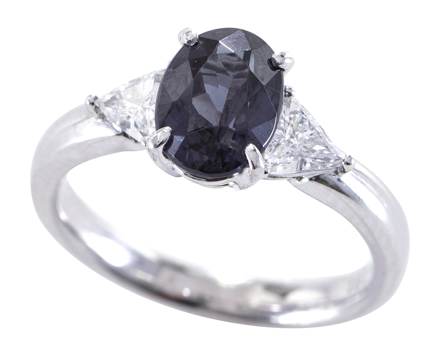 The oval faceted garnet of 1.91cts, flanked by trilliant cut diamonds, mounted in 18ct white gold, ring size M, garnet accompanied by GSL gemstone authentication report number AA59643 stating natural colour change garnet.