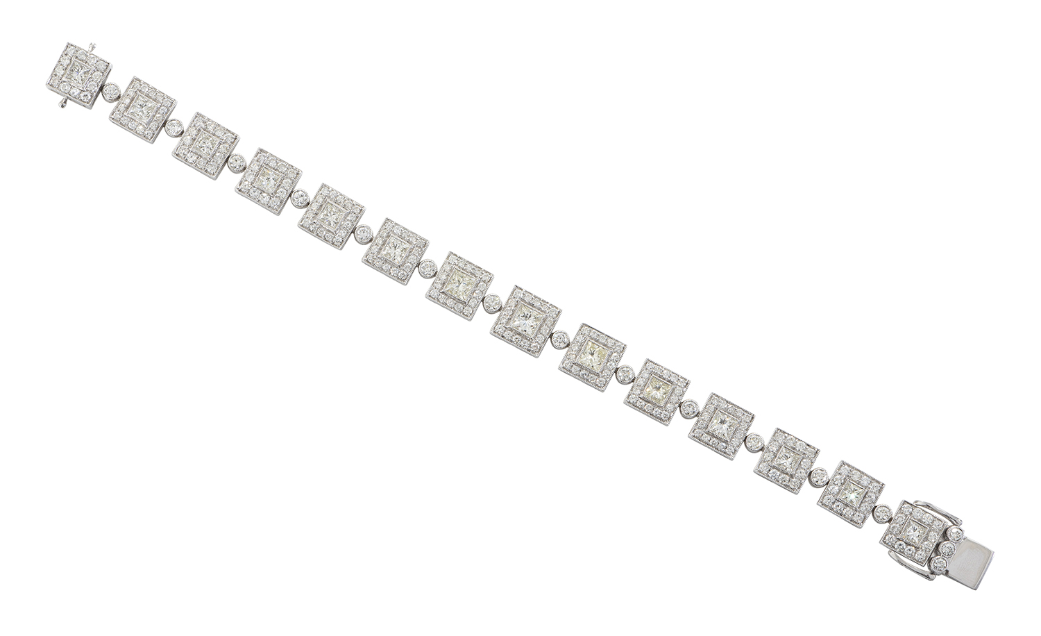 Comprising fourteen square panels, each set with a princess cut diamond surrounded by round brilliant cut diamonds, all totalling 9.46cts, mounted in 18ct white gold, total length 170mm.