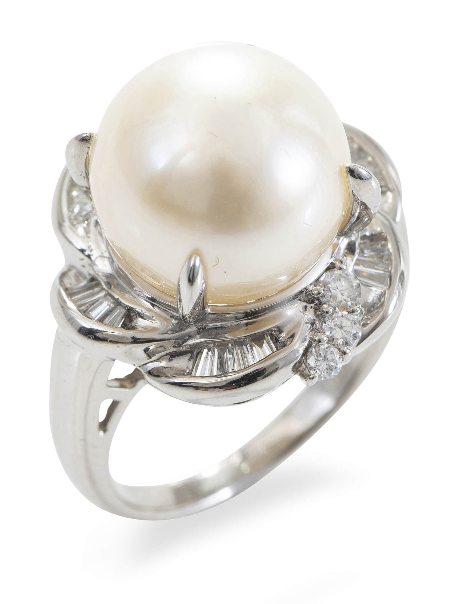The near round pearl of cream and white hue measuring 13.1mm, surrounded by round brilliant and baguette cut diamonds, mounted in 18ct white gold, ring size N.