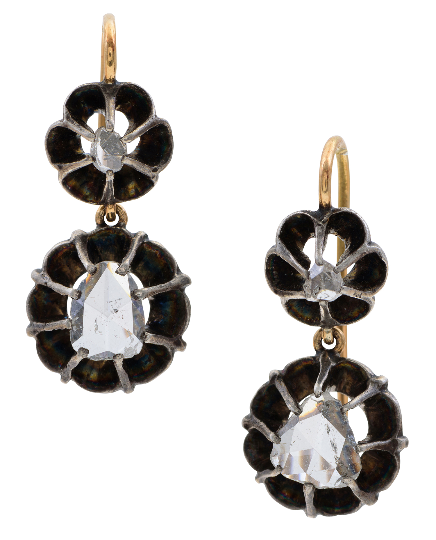 The rose cut diamond drops measure 7 x 5.4 x 1.7mm and 7 x 6.5 x 1.7mm respectively.
