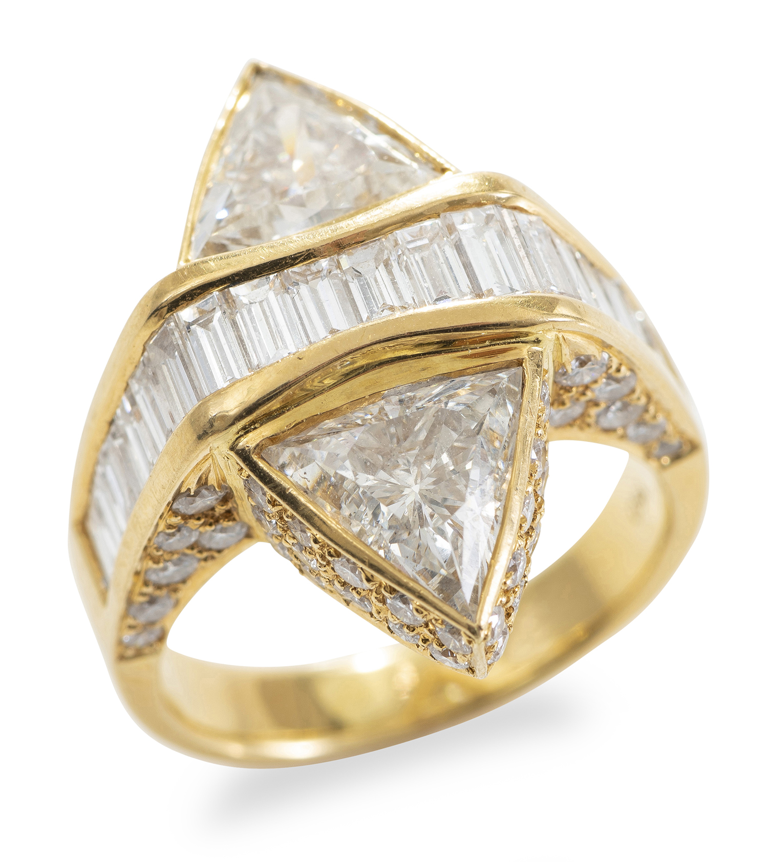 Comprising two trilliant cut diamonds totalling 3.06cts, separated by a row of baguette cut diamonds totalling 1.29cts, with further diamonds to the surround totalling 1.50cts, mounted in 18ct gold, ring size L.