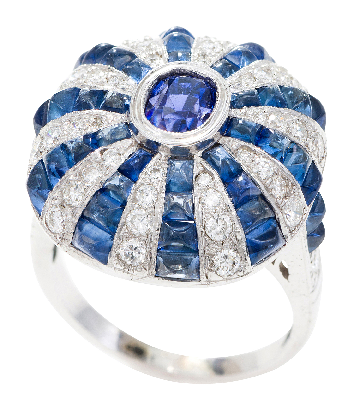 The domed setting centrally set with an oval faceted tanzanite, surrounded by alternating graduated rows of sugarloaf cut sapphires and round brilliant cut diamonds, mounted in 18ct white gold, ring size N.