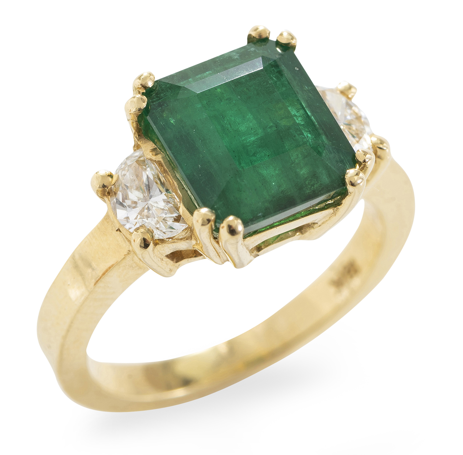 The emerald cut emerald of 2.75cts, flanked by half moon cut diamonds, mounted in 18ct gold, ring size N.