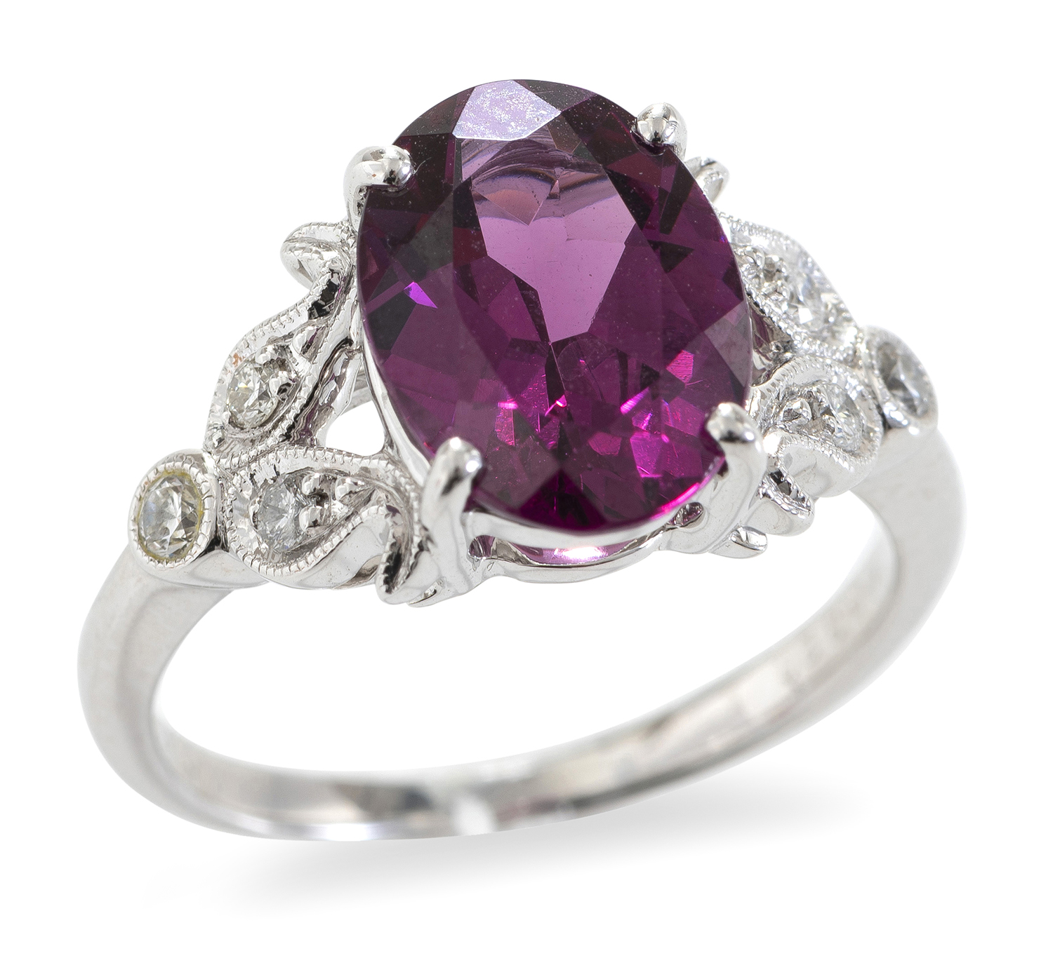 The oval faceted garnet totalling 3.20cts, flanked by grain set diamond shoulders, mounted in platinum, ring size L.