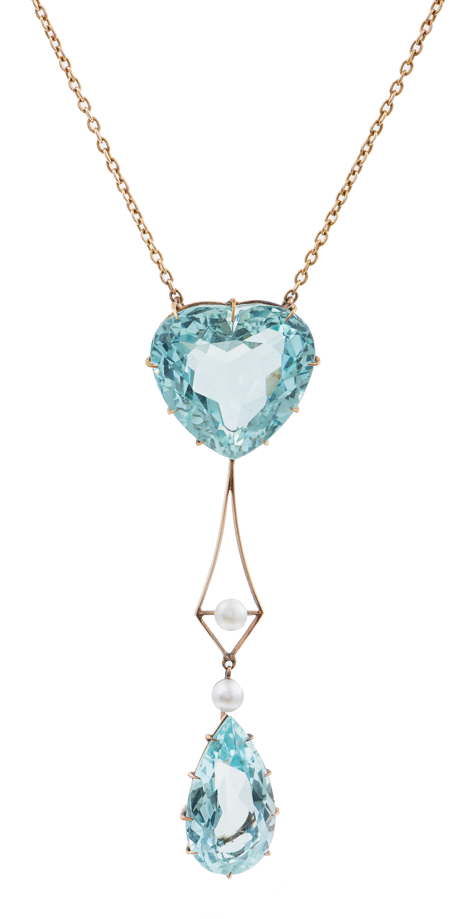 Featuring a heart faceted aquamarine of 35.25cts, suspending a split bar set with two pearls, to a pear faceted aquamarine of 16.18cts, suspended from an integral chain, all in 15ct gold.