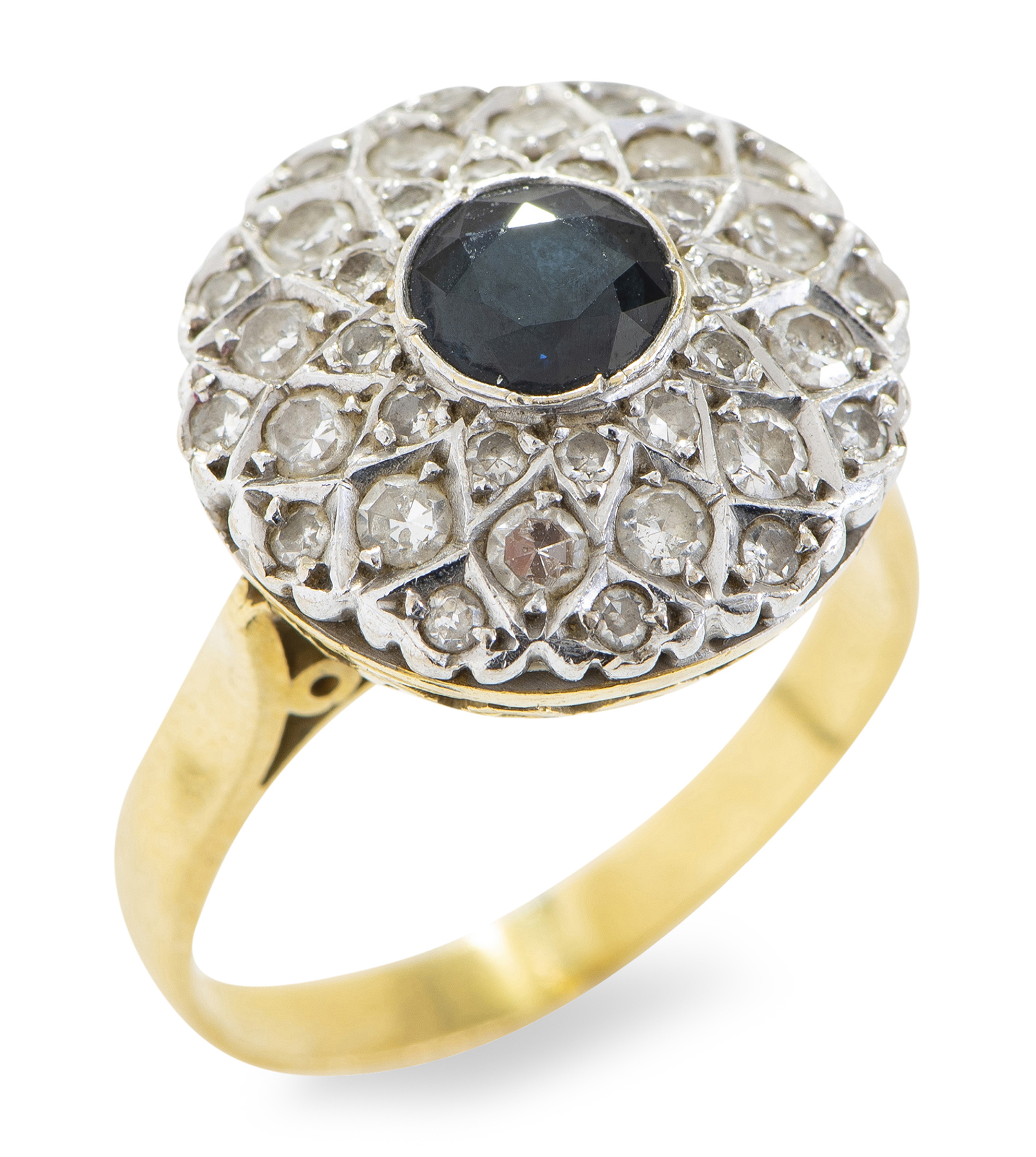 Ring presents in overall good vintage condition. All stones secure.. Scractches and marks to the gold work consistent with wear. Sapphire of a very dark blue / black colour.