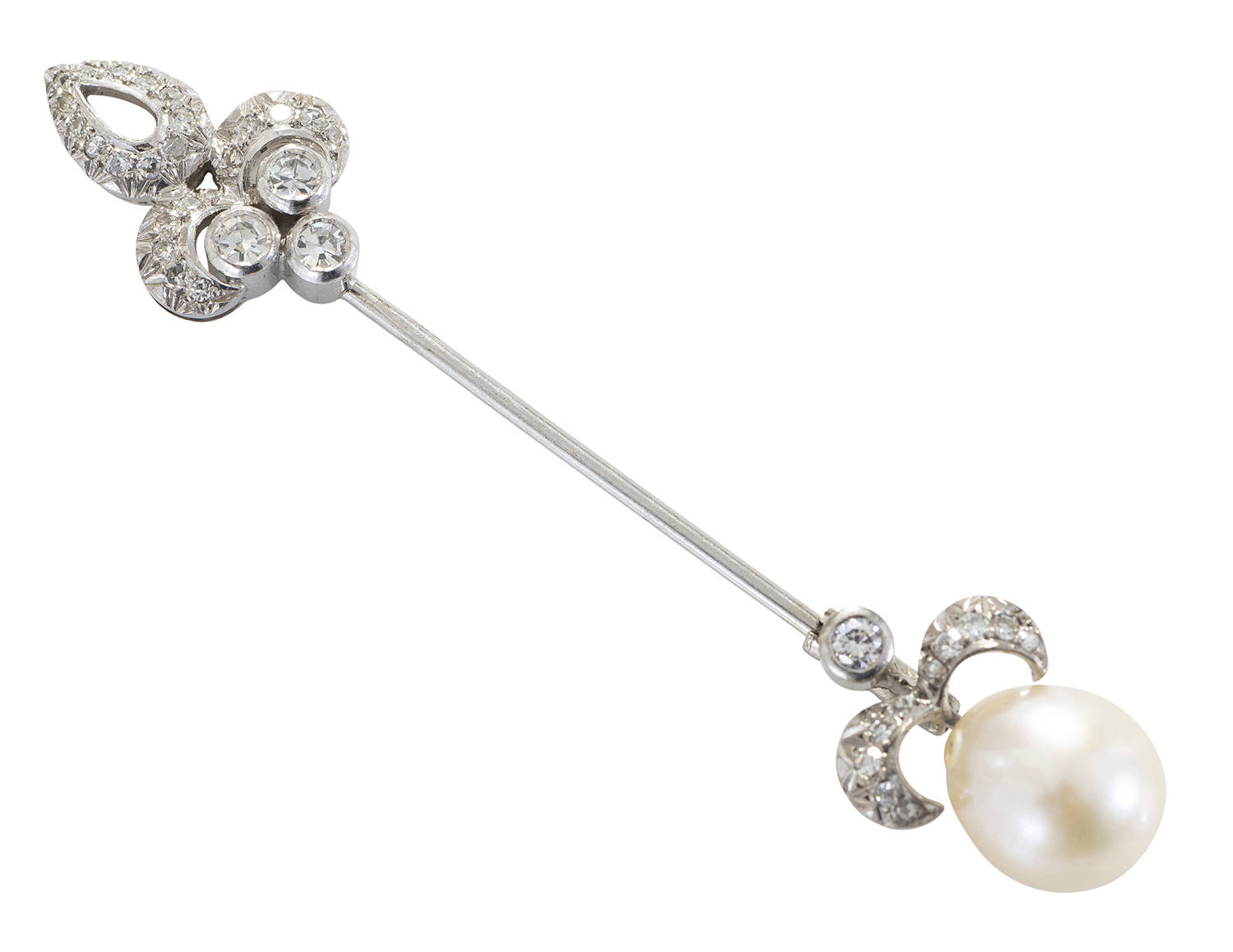 The pin presents in very good antique condition. All stones secure in their settings. Pearl displays good lustre and is blemish free. Pin secures firmly.