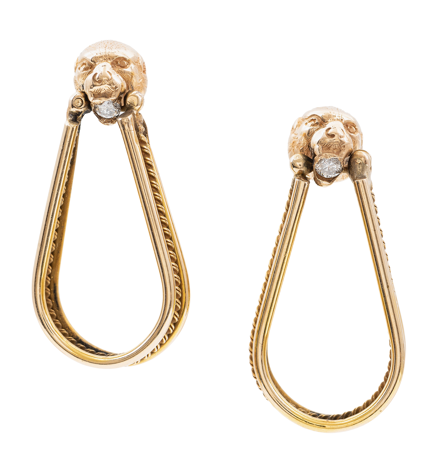 Each styled as a leopard head, with a round brilliant cut diamond set to the mouth, suspending a rope twisted elongated hoop, mounted in 18ct gold.