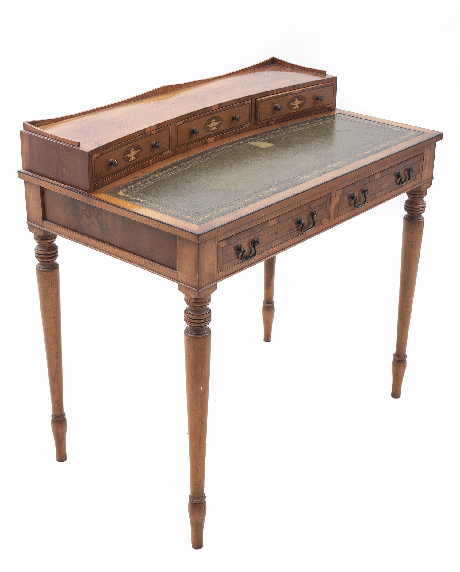 featured huon pine veneer, dent and surface scratches throughout. stain/discolouration to leather inset. Condition consistent with age and use.