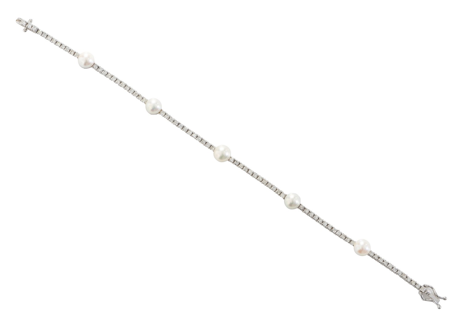 Featuring five round pearls each measuring 6.4mm, set to a diamond line bracelet totalling 2.10cts, in 18ct gold, total length 185mm.