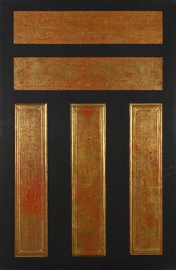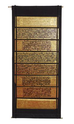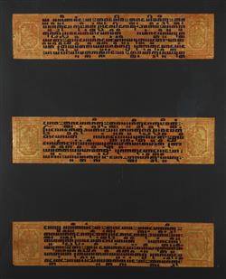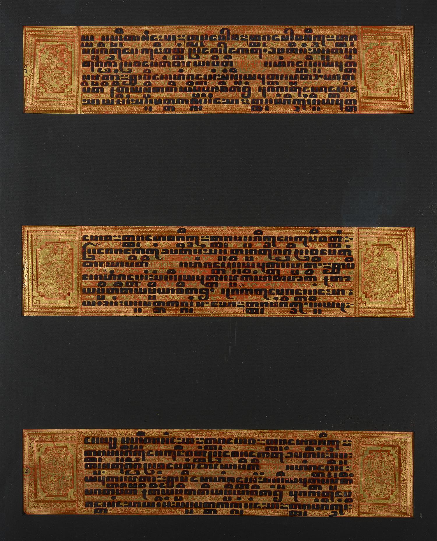 The largest framed group comprising of twelve lacquered and gilt pages, each page bearing six lines of Pali text in deep brown lacquer. One other framed group of three similar lacquer pages, and the last with gilt lacquer end pages and book covers. Kammavaca consisted of rules and instructions for new monks entering monastic life, and were often commissioned by the parents of the young monks as a gift for presentation to the monastery.