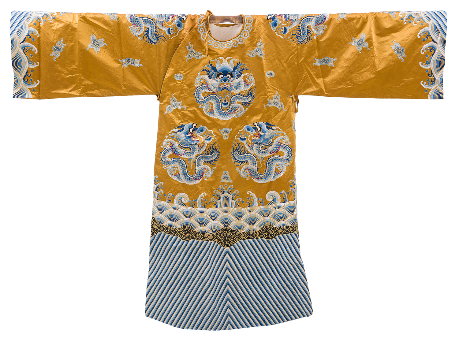The yellow ground robe decorated with blue and gold thread dragons, the lower border with stylised decoration depicting earth and ocean. Silk and metal wrapped thread.