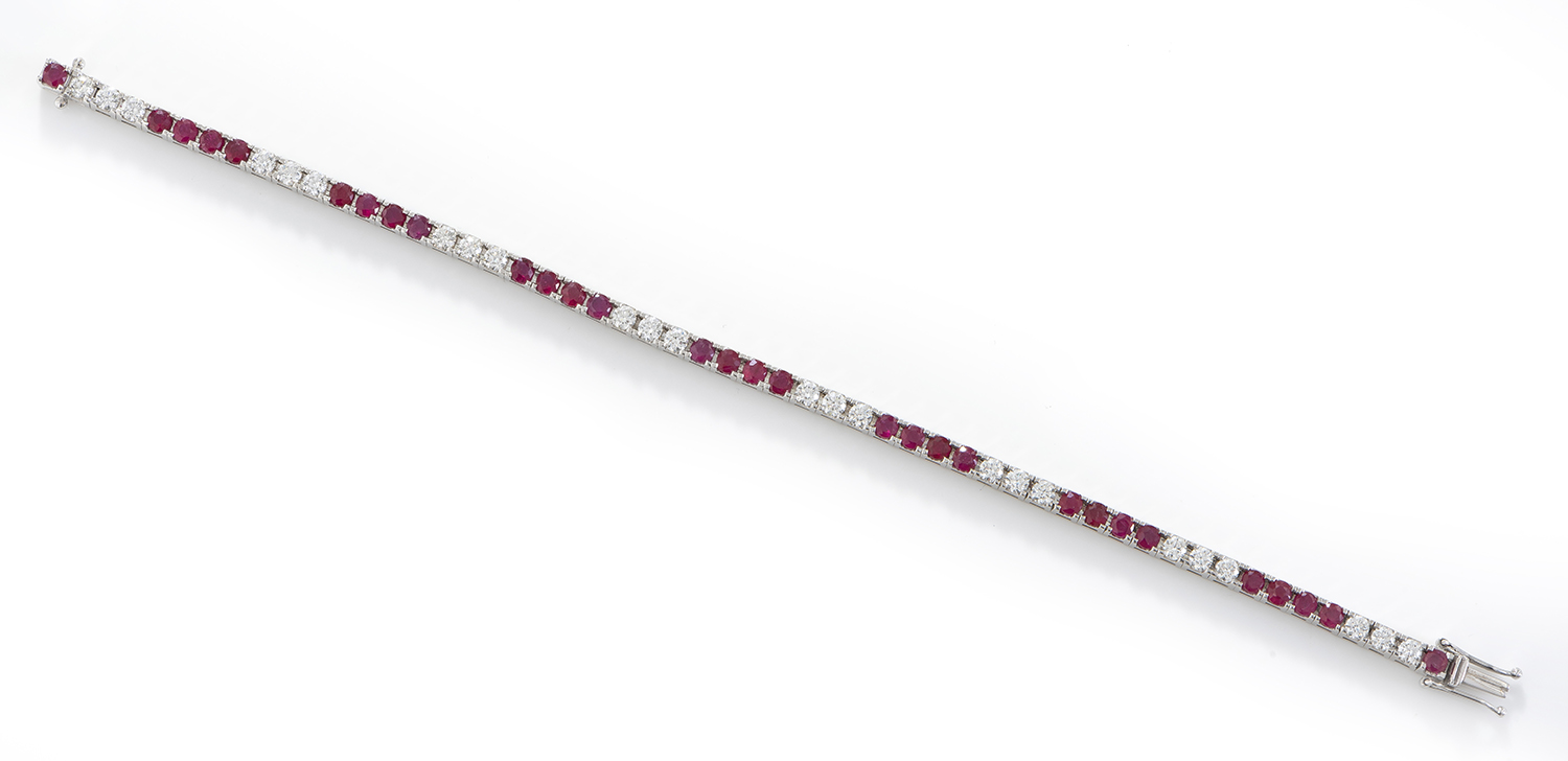 Comprising round cut rubies totalling 4.12cts, interspersed with twenty four round brilliant cut diamonds totalling 2.18cts, mounted in 18ct white gold, total length 190mm.
