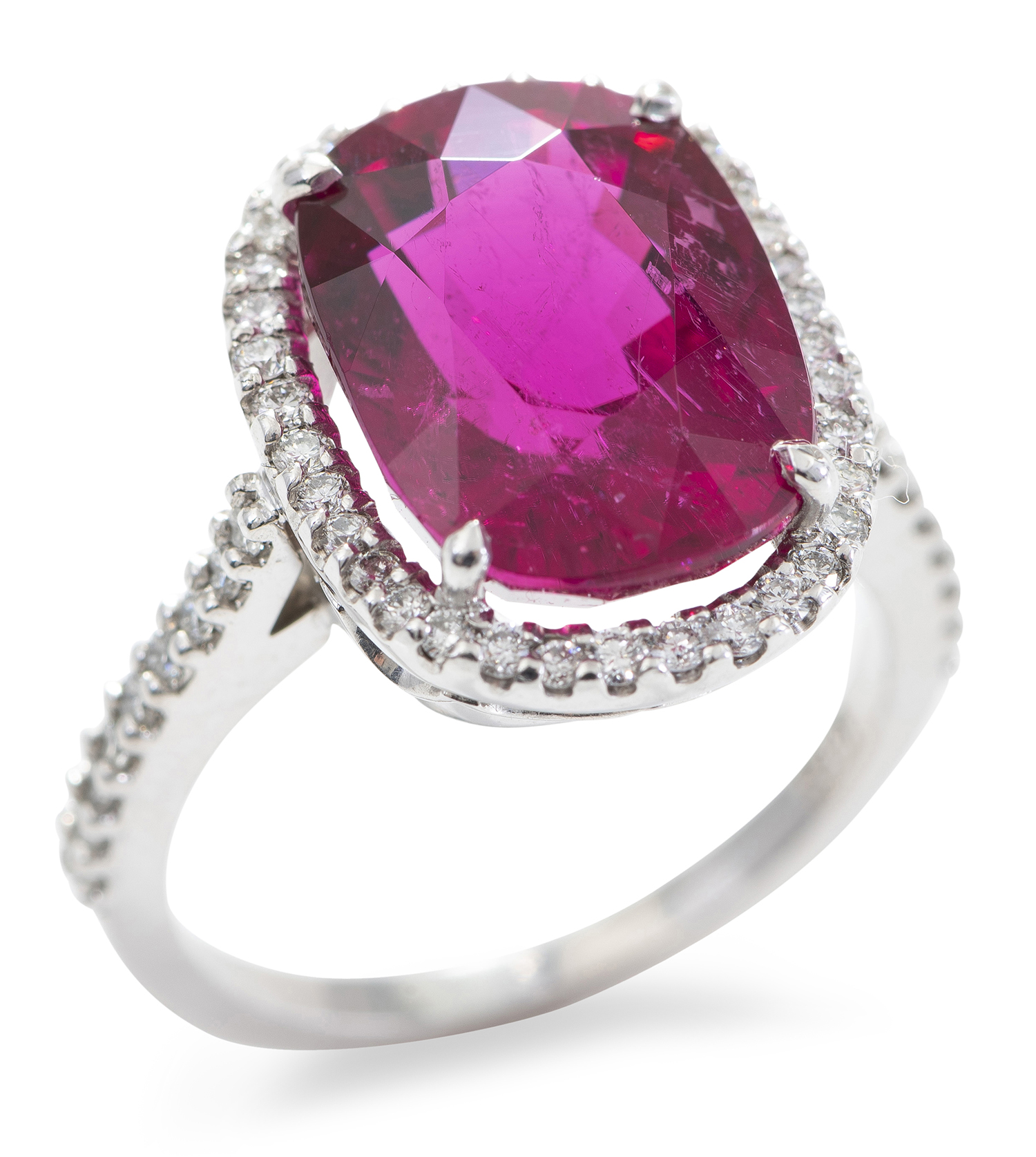 The cushion cut tourmaline of 7.23cts, surrounded and shouldered by diamonds totalling 0.50cts, mounted in 18ct white gold, ring size L.