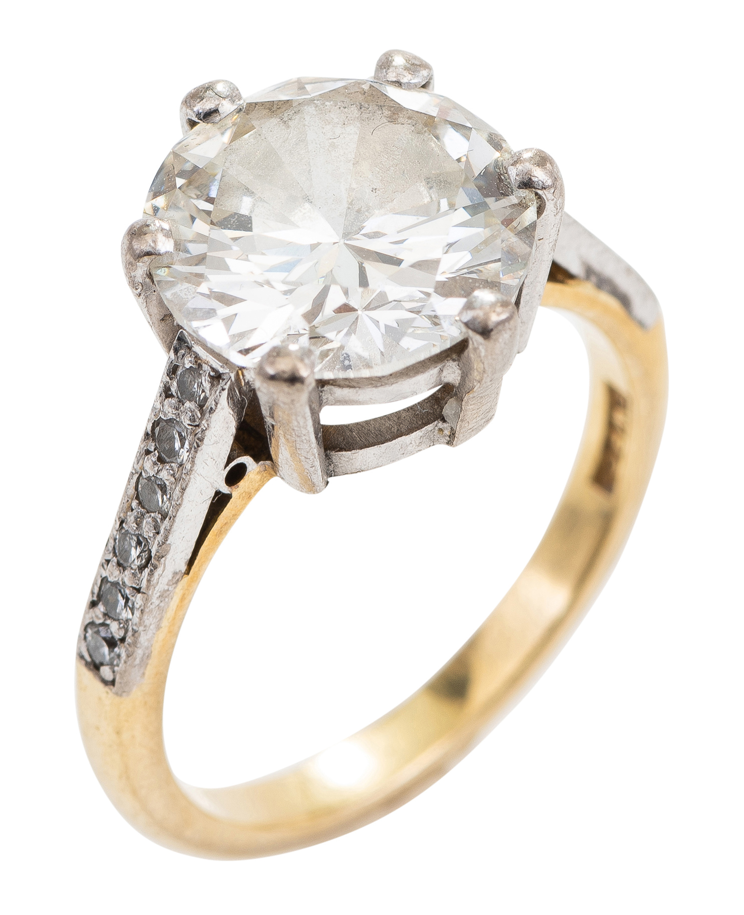 The ring presents in very good condition with all stones secure in their settings. Some scratches and marks to the gold work consistent with wear. Central diamond totalling 4.03cts, colour K, clarity SI1.