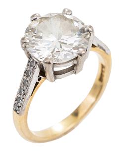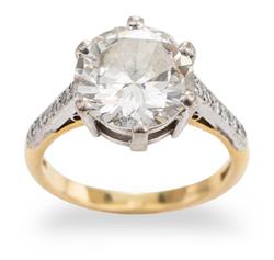 Featuring a round brilliant cut diamond of 4.03cts, flanked by diamond set shoulders, mounted in 18ct gold, hallmarked London, 2006, ring size M.