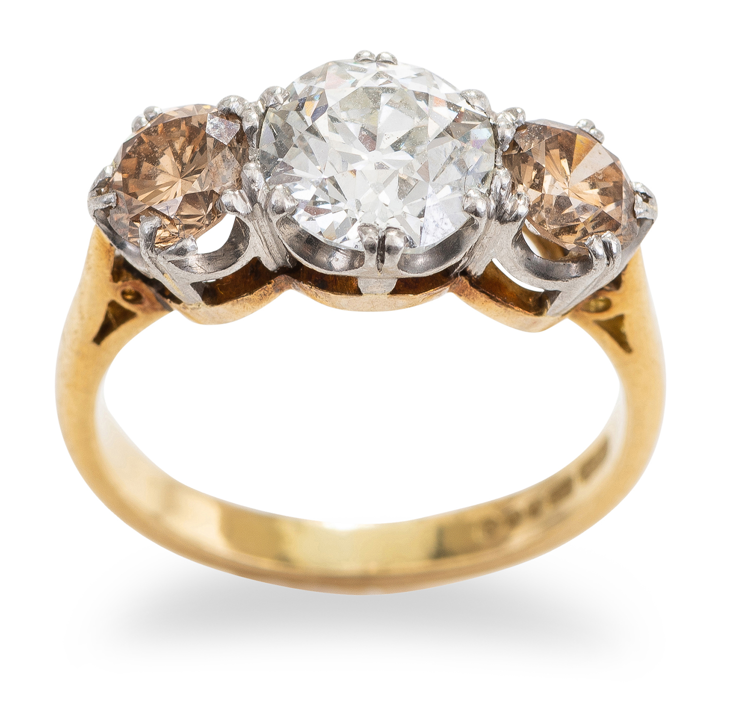 Featuring an old European cut diamond of 1.80cts, flanked by champagne round brilliant cut diamonds totalling 1.22cts, mounted in 18ct gold, hallmarked London, 1999, ring size M.