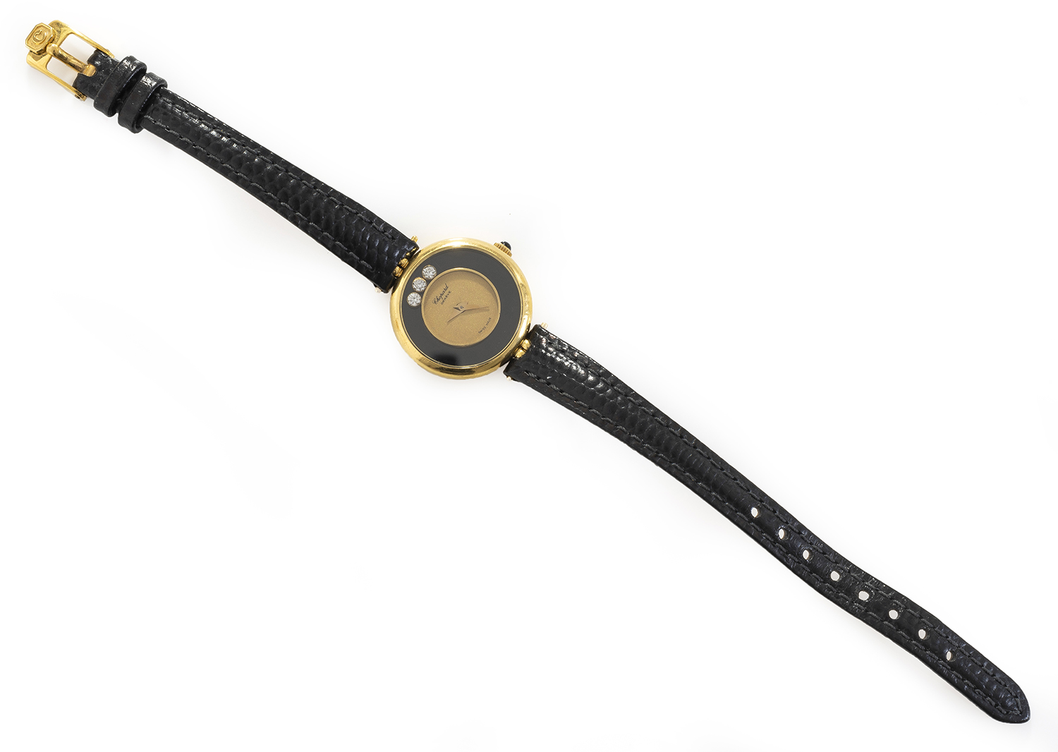 Manual wind movement, circular gilded dial with three floating diamonds to the surround, signed case, dial and movement, 18ct gold case and black leather bands, case reference 163601/4063, 22mm diameter.