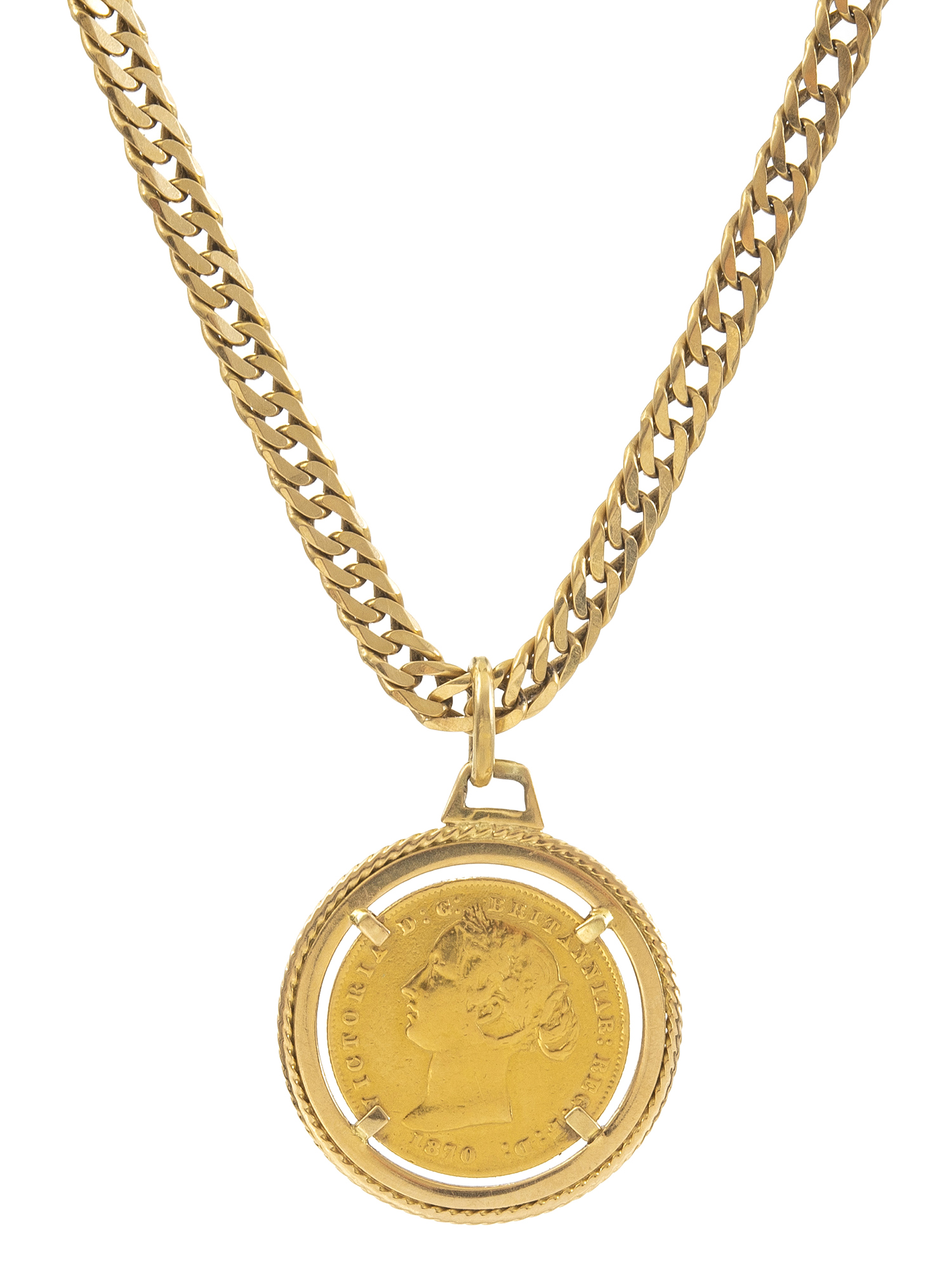 The Sydney Mint coin dated 1870, to an 18ct gold frame, suspended from a conforming curblink chain, total length 590mm.