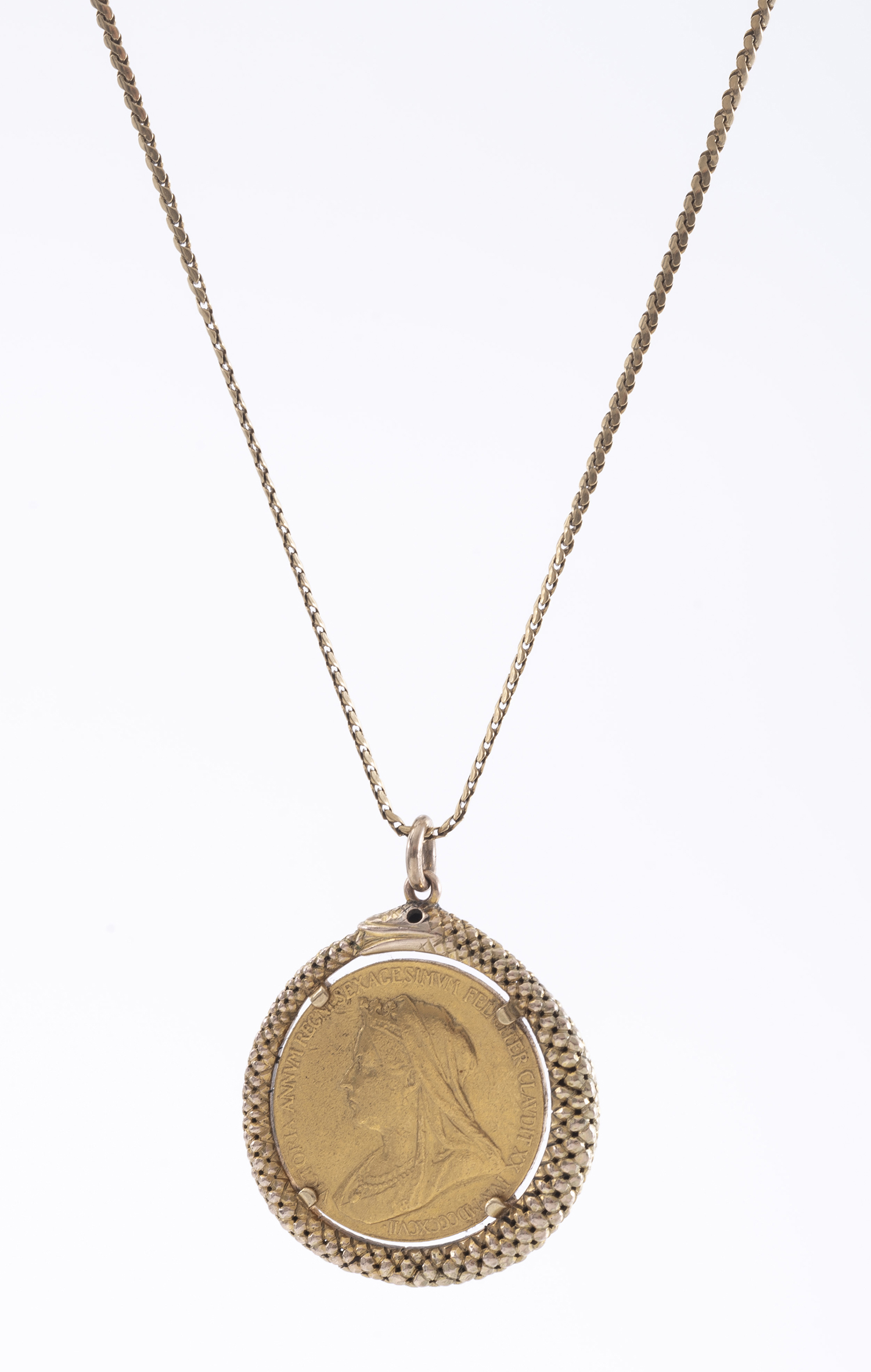 The medal commemorating Queen Victoria's jubilee, set within a serpent frame, mounted in gold, on a conforming 18ct gold chain, total length 690mm.