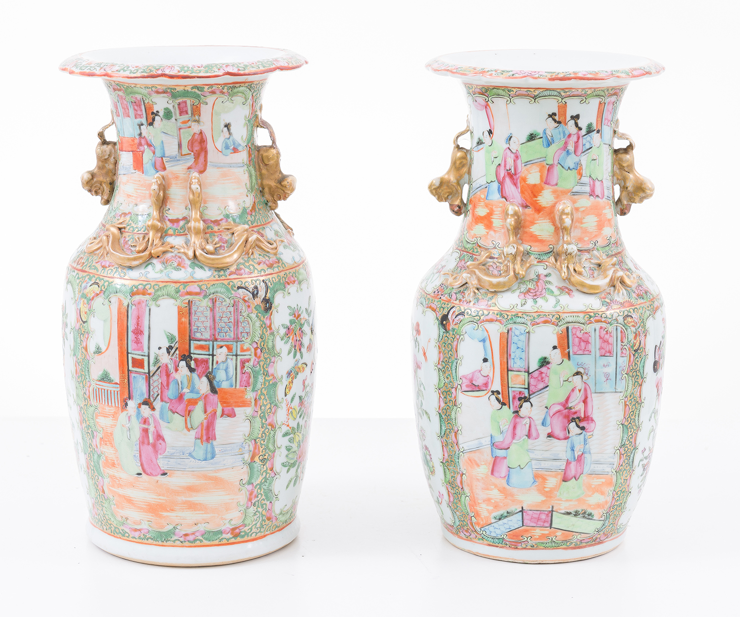 Canton rose medallion pattern, for export. Restoration to one guardian lion tail on one vase, possible regilding, wear and minor losses to enamels and gilding throughout.