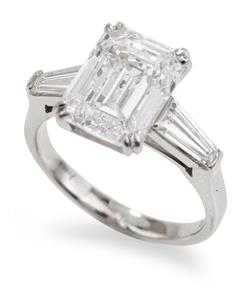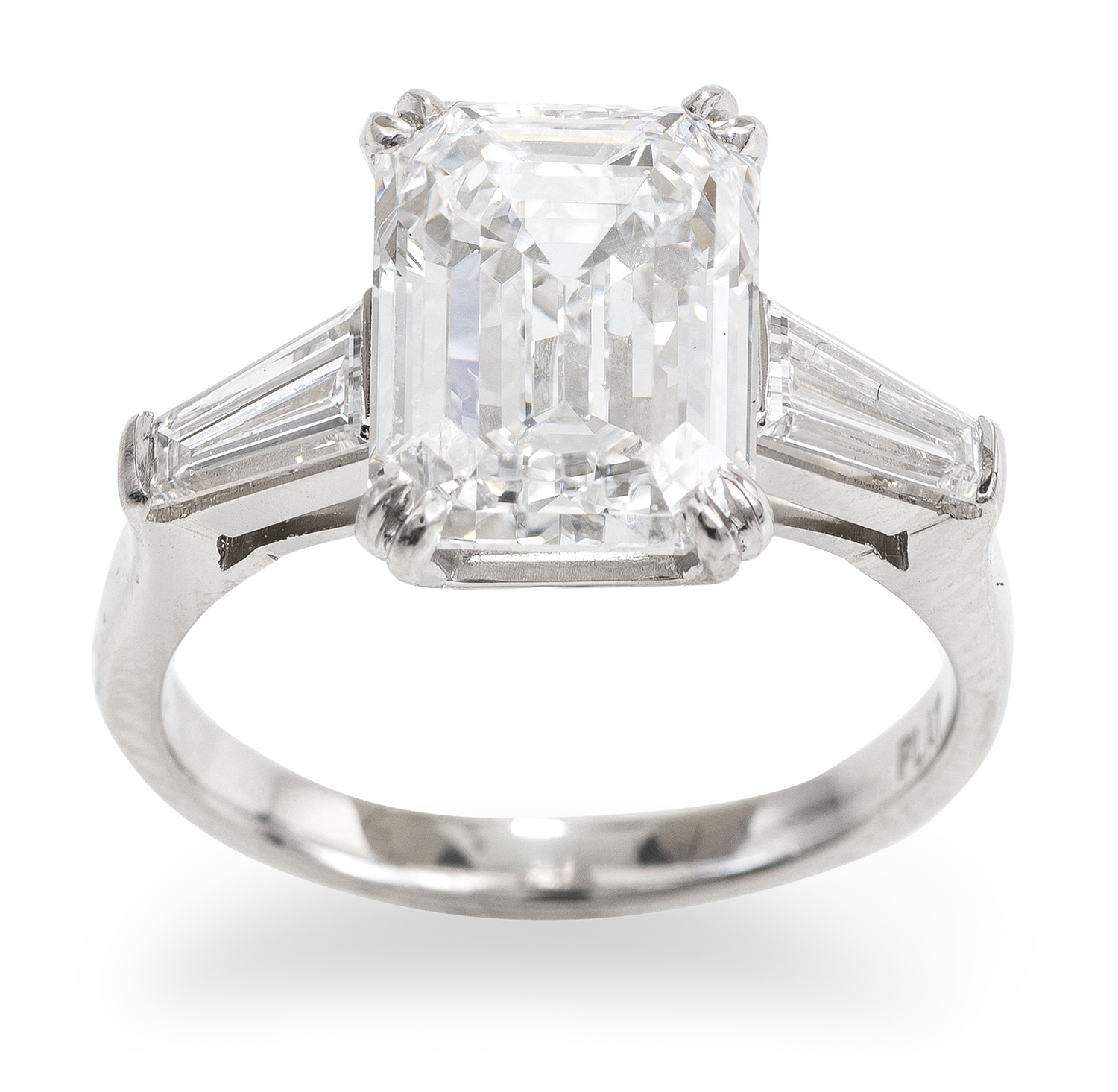 The emerald cut diamond of 3.52cts, flanked by tapered baguette cut diamonds totalling 1.06cts, mounted in platinum, ring size I, accompanied by GIA report number 2175017344 stating the diamond is Type IIa, colour D and clarity Internally Flawless.