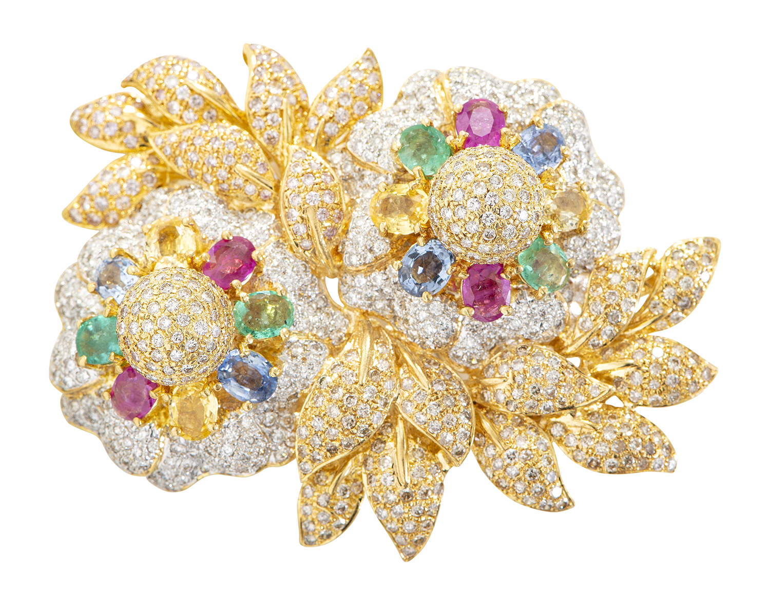 The brooch presents in very good condition. There is one small diamond missing next to the emerald on one flower, otherwise all stones intact.