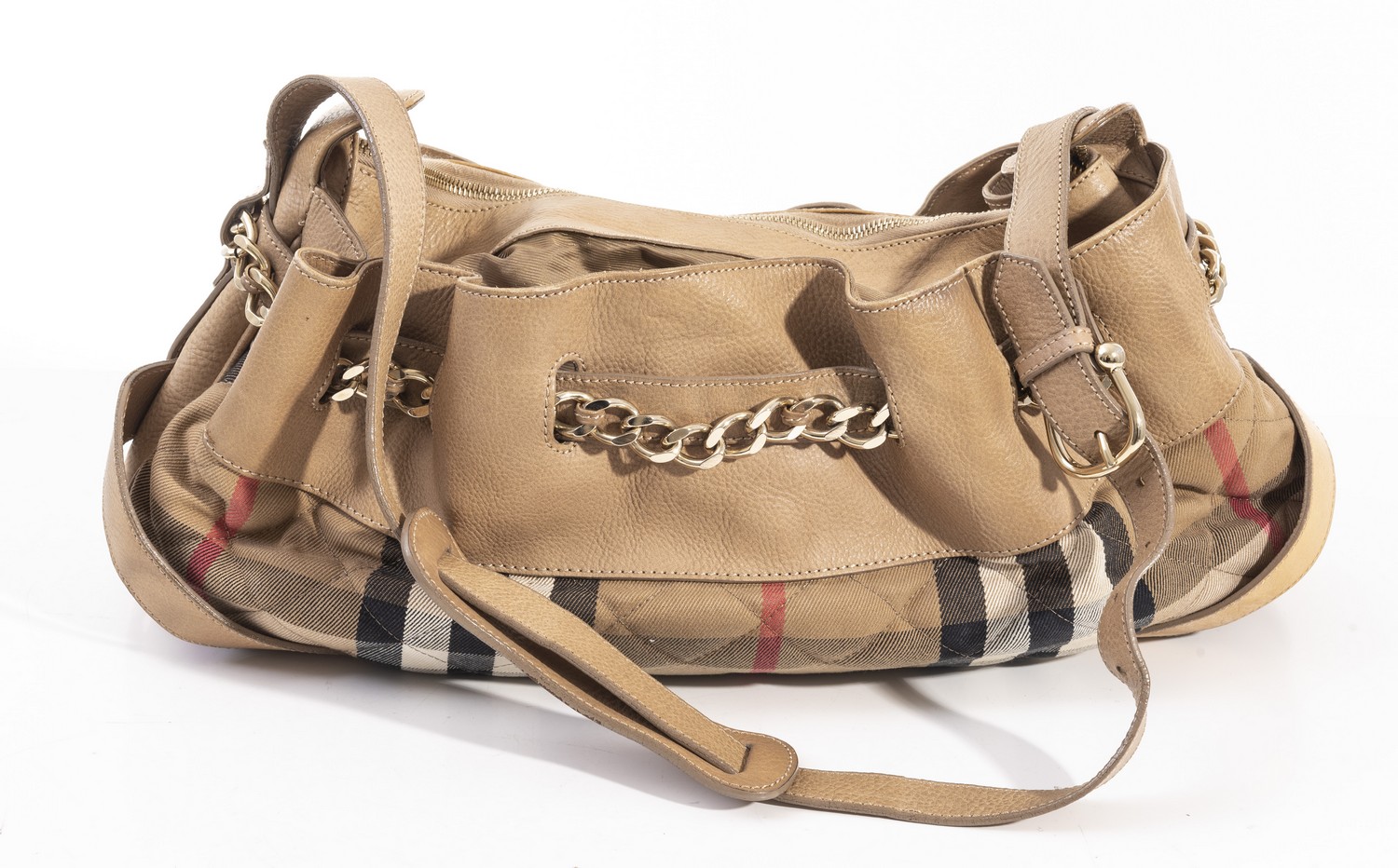 Styled in light nude grainy calfskin leather trim, Burberry check quilted detail and chain embellishment, 22 x 40 x 11cm.