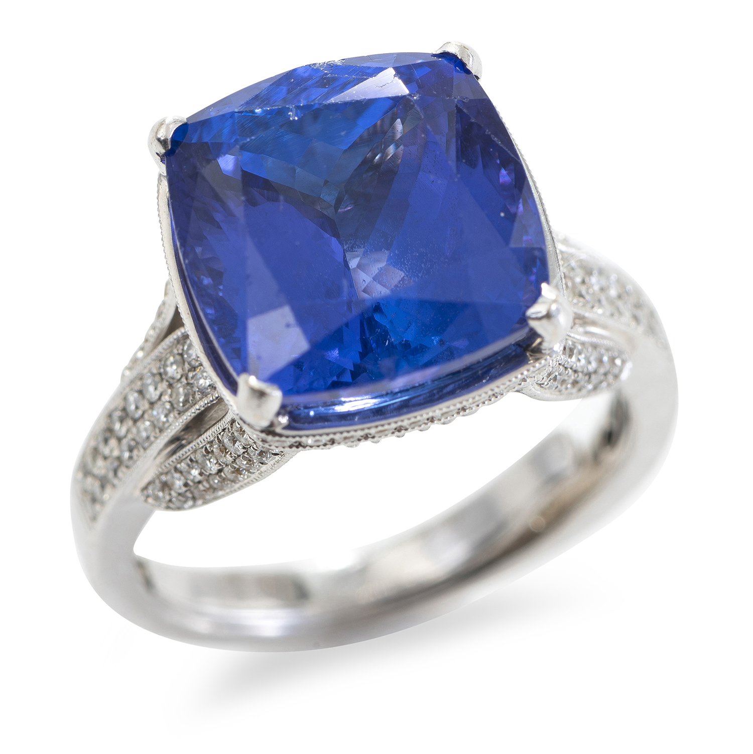 The cushion cut tanzanite of 7.40cts, with diamond set shoulders and surrounds, mounted in 18ct white gold, ring size O.