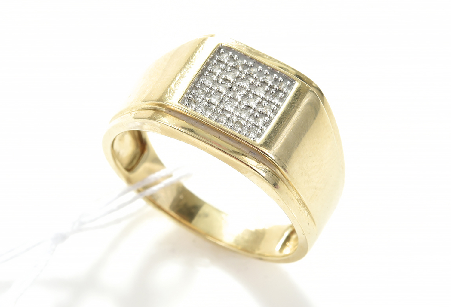 A GENTS PAVE DIAMOND RING IN 9CT GOLD.