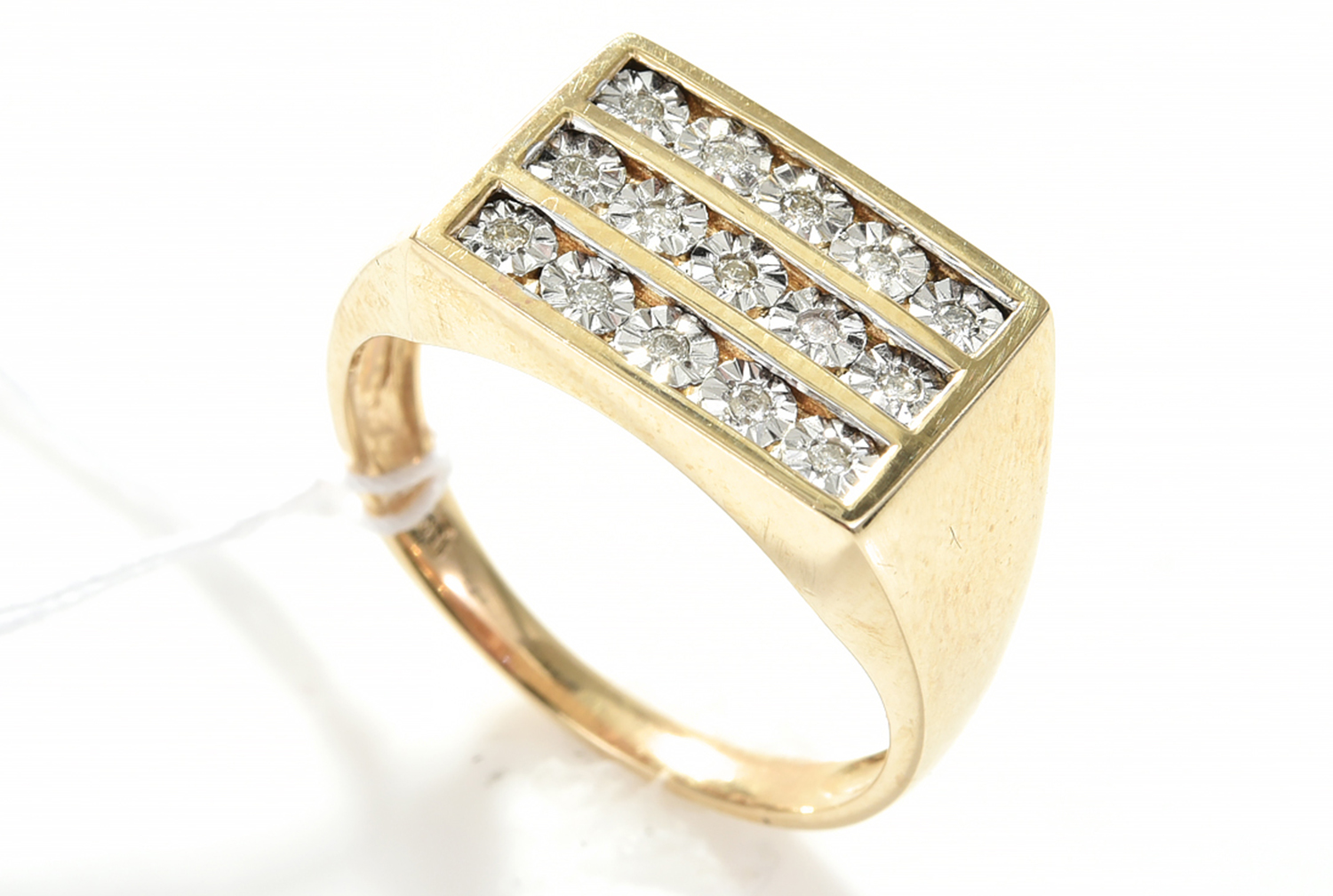 A GENTS DIAMOND SET RING IN 18CT GOLD.