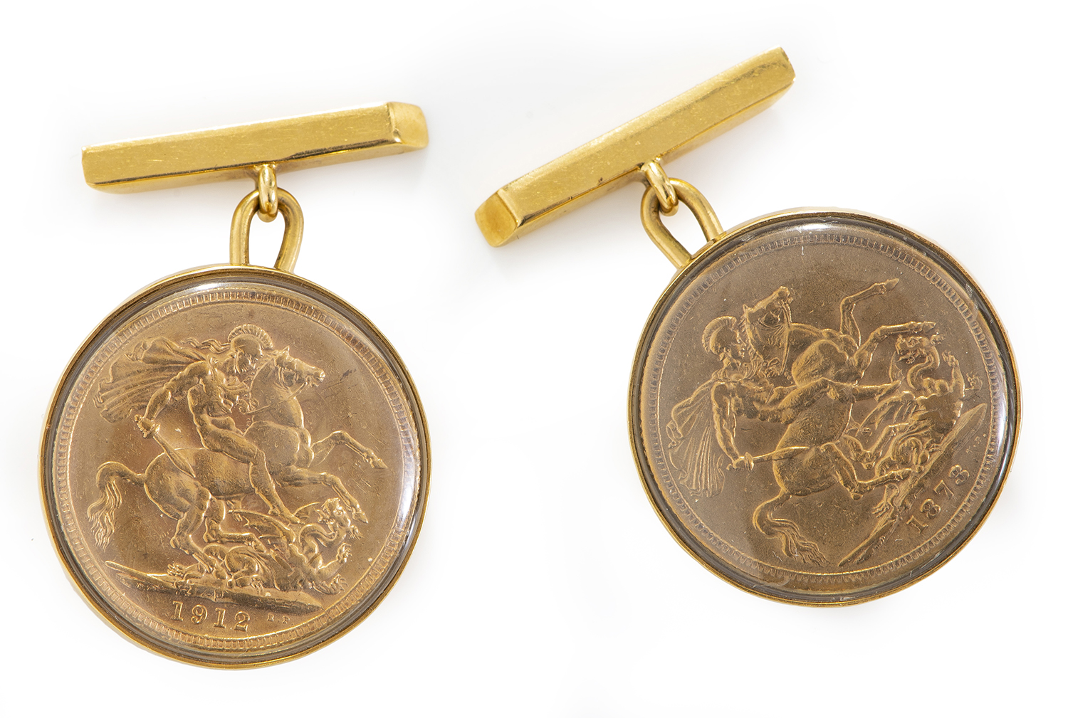 The sovereigns dated 1873 and 1912 respectively, mounted in 18ct gold.