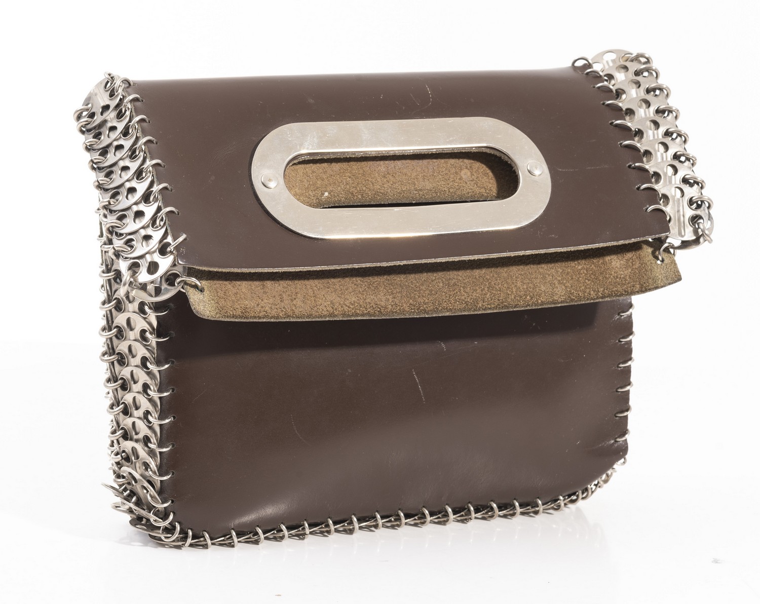 Styled in brown leather with disc and chain detail to sides, 20 x 25.5 x 5cm.