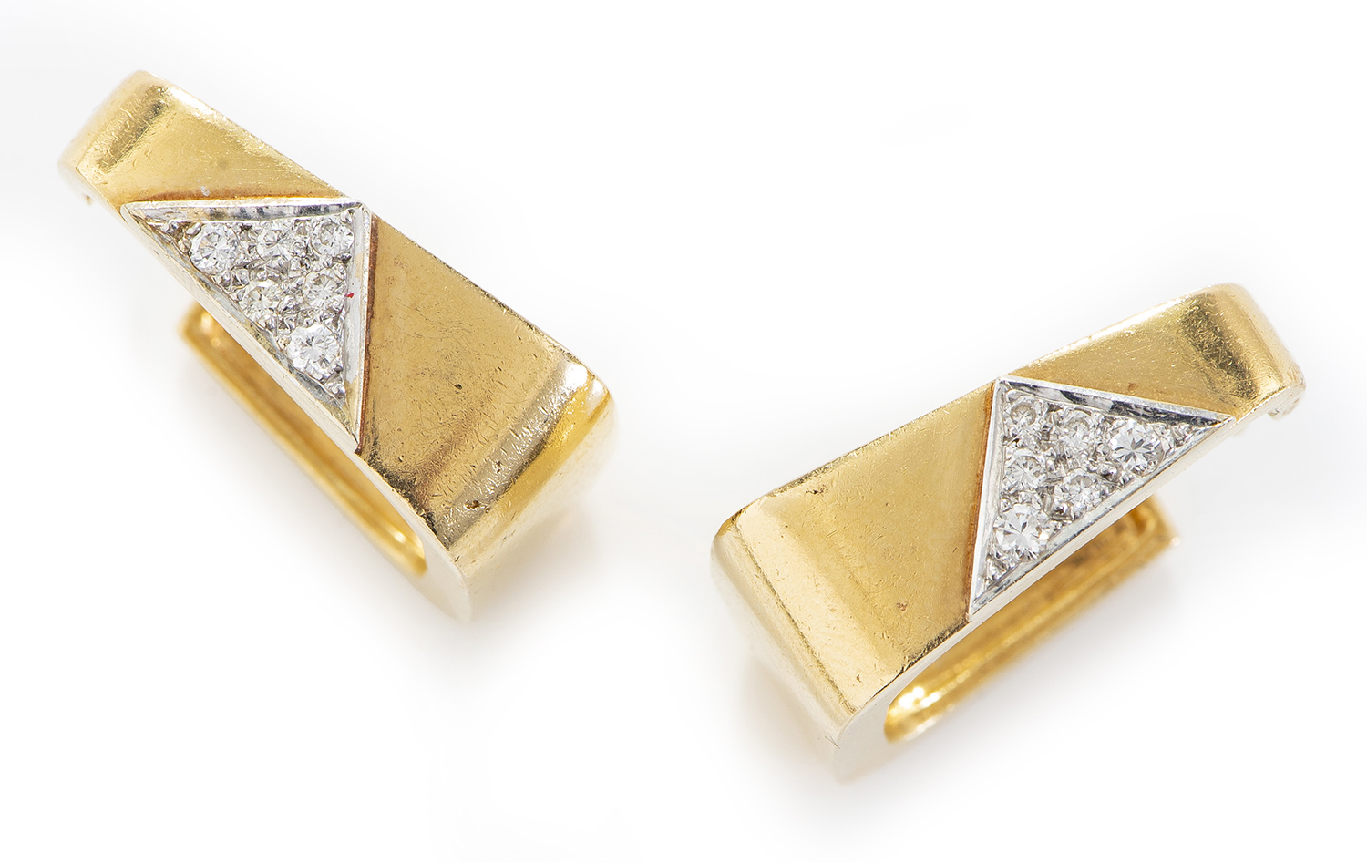 Of square form, each with a triangular diamond set plaque, mounted in 14ct gold.