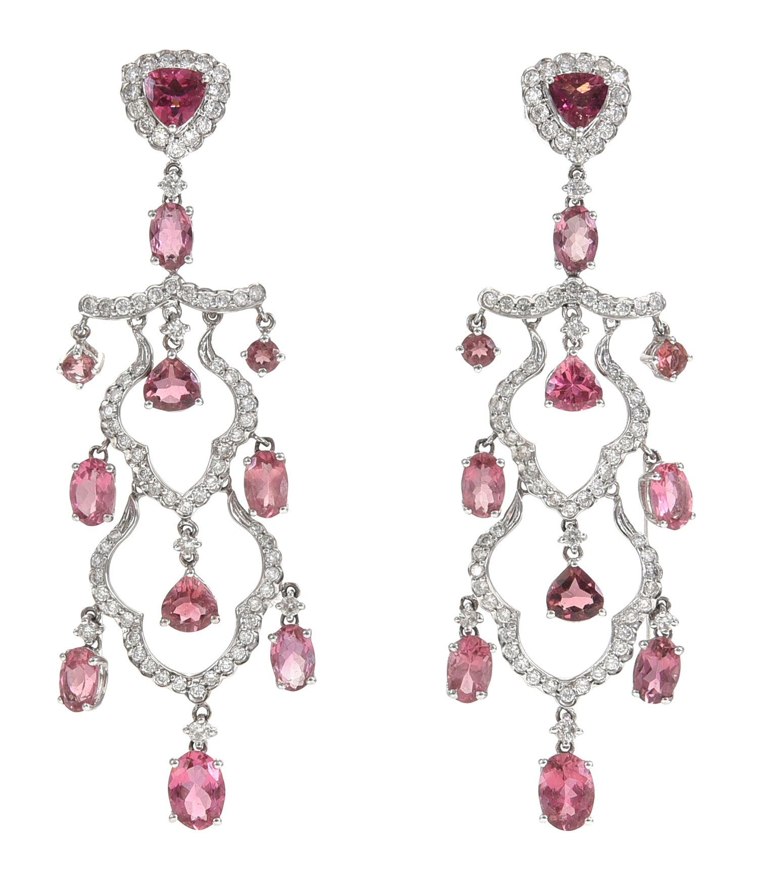 Of chandelier design, each earring comprising tourmalines totalling 7.34cts, surrounded and surmounted by diamonds totalling 0.50cts, mounted in 18ct white gold.
