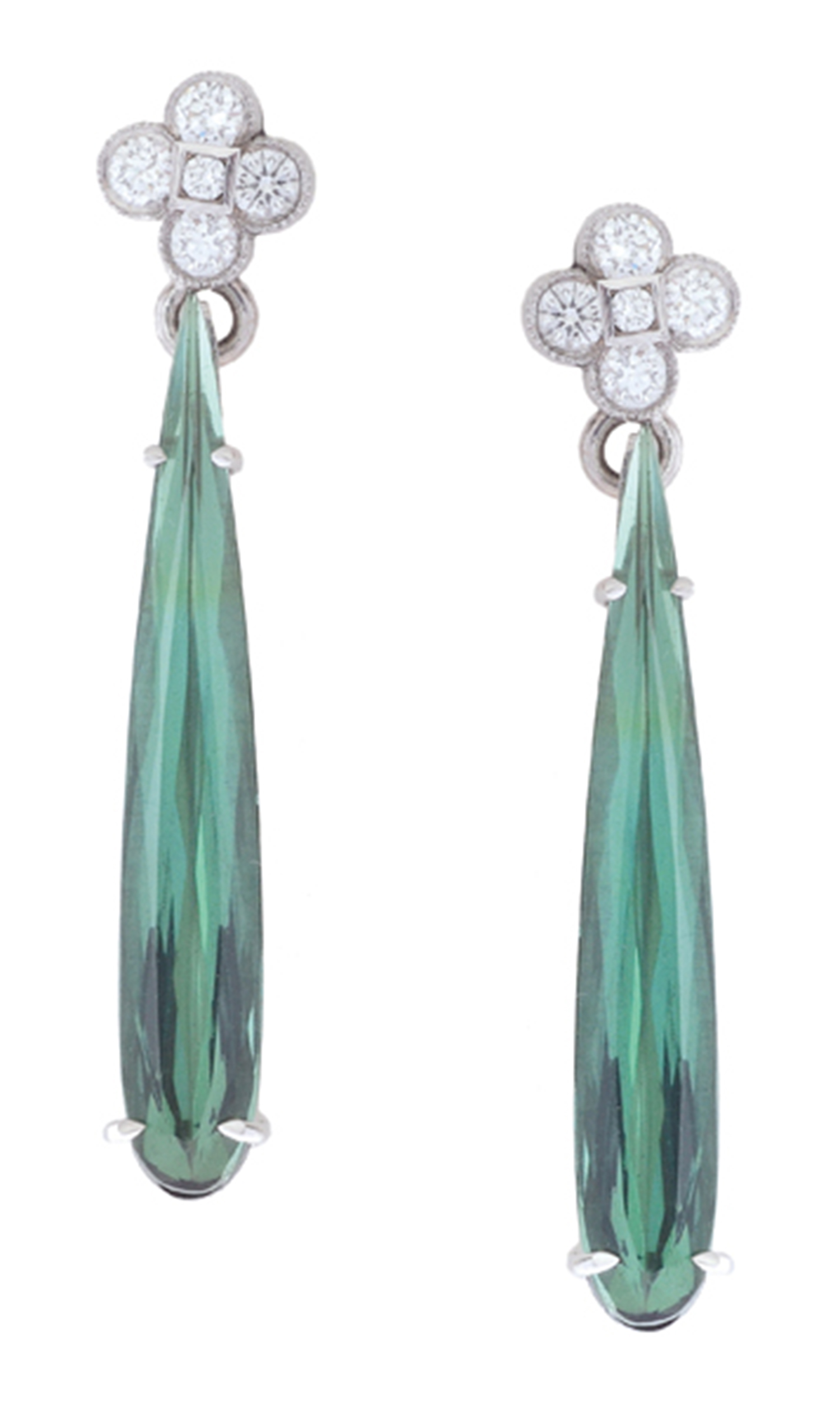 Each earring comprising an elongated drop shaped tourmaline, suspended below a diamond cluster stud fitting, mounted in 18ct white gold.