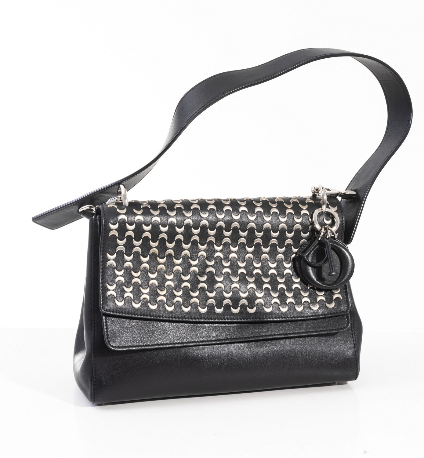 Styled in black leather with an embellished upper flap in silver metal, wide leather shoulder strap and leather DIOR charm, 27 x 21 x 13cm.