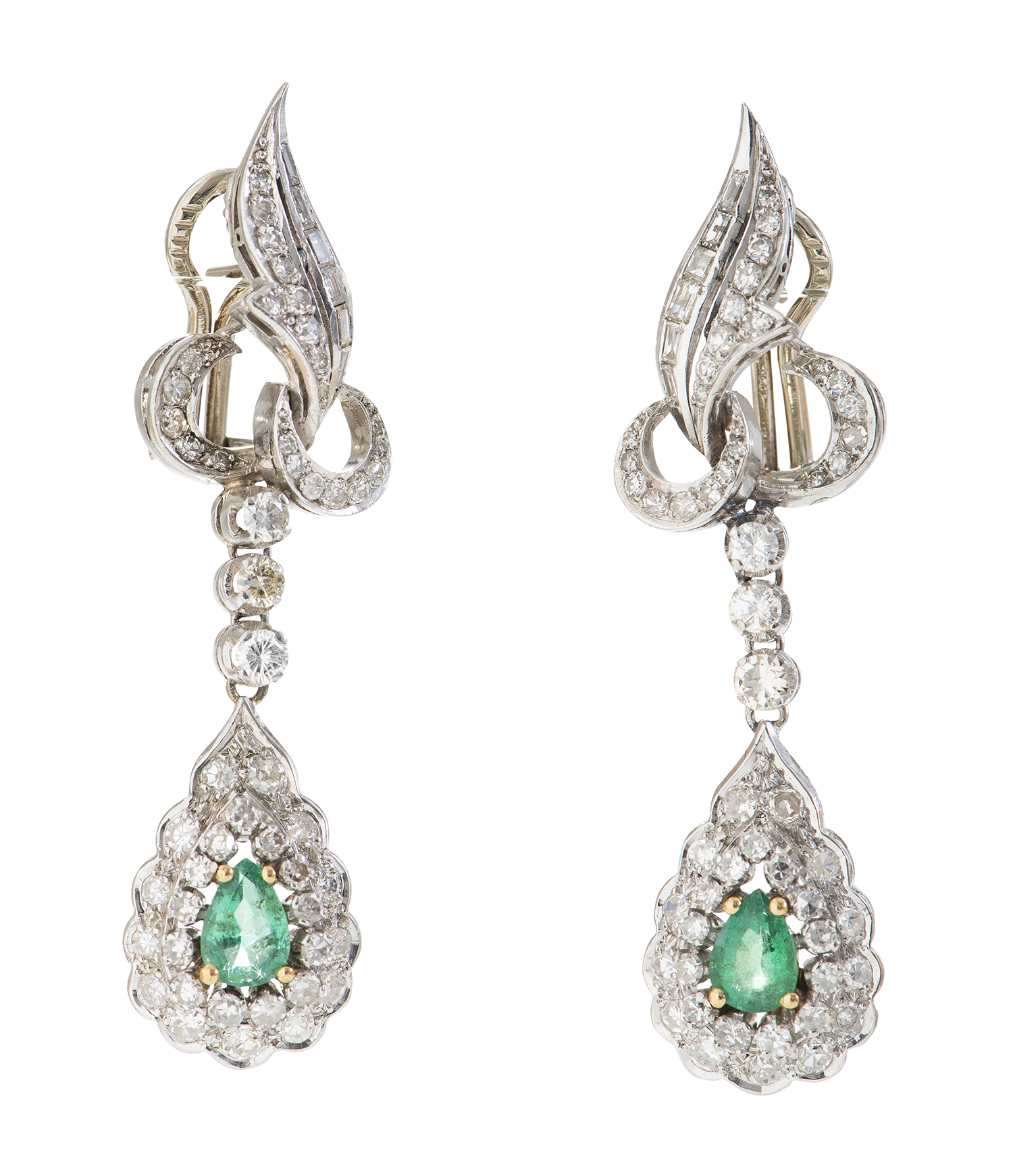 Each set with a pear cut emerald of 0.90ct, surrounded and surmounted by round brilliant and baguette cut diamonds, the volute-shaped clasp set with baguette and round brilliant cut diamonds totalling 1.55cts, mounted in 18ct white gold.
