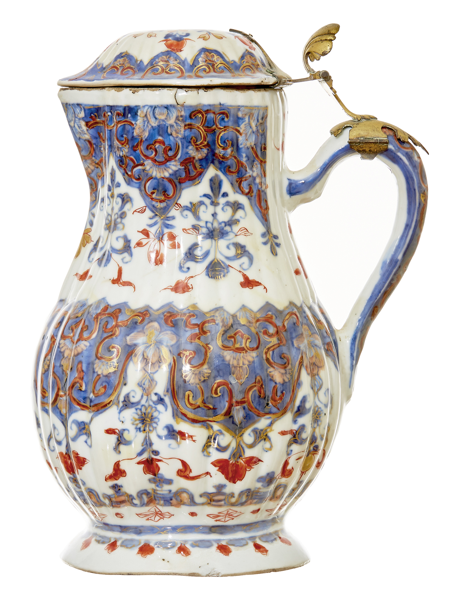 The jug painted with lappet borders and pendant scrolling flowers and foliage in cobalt blue, iron red and gilding , with a European gilt metal shell shaped handle mount