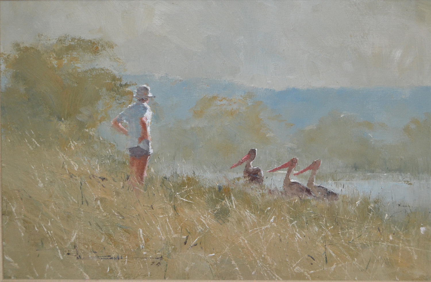 AUSTRALIAN SCHOOL, BOY WITH THREE PELICANS 1986, OIL ON BOARD, DATED LOWER RIGHT :86, 44 X 60CM