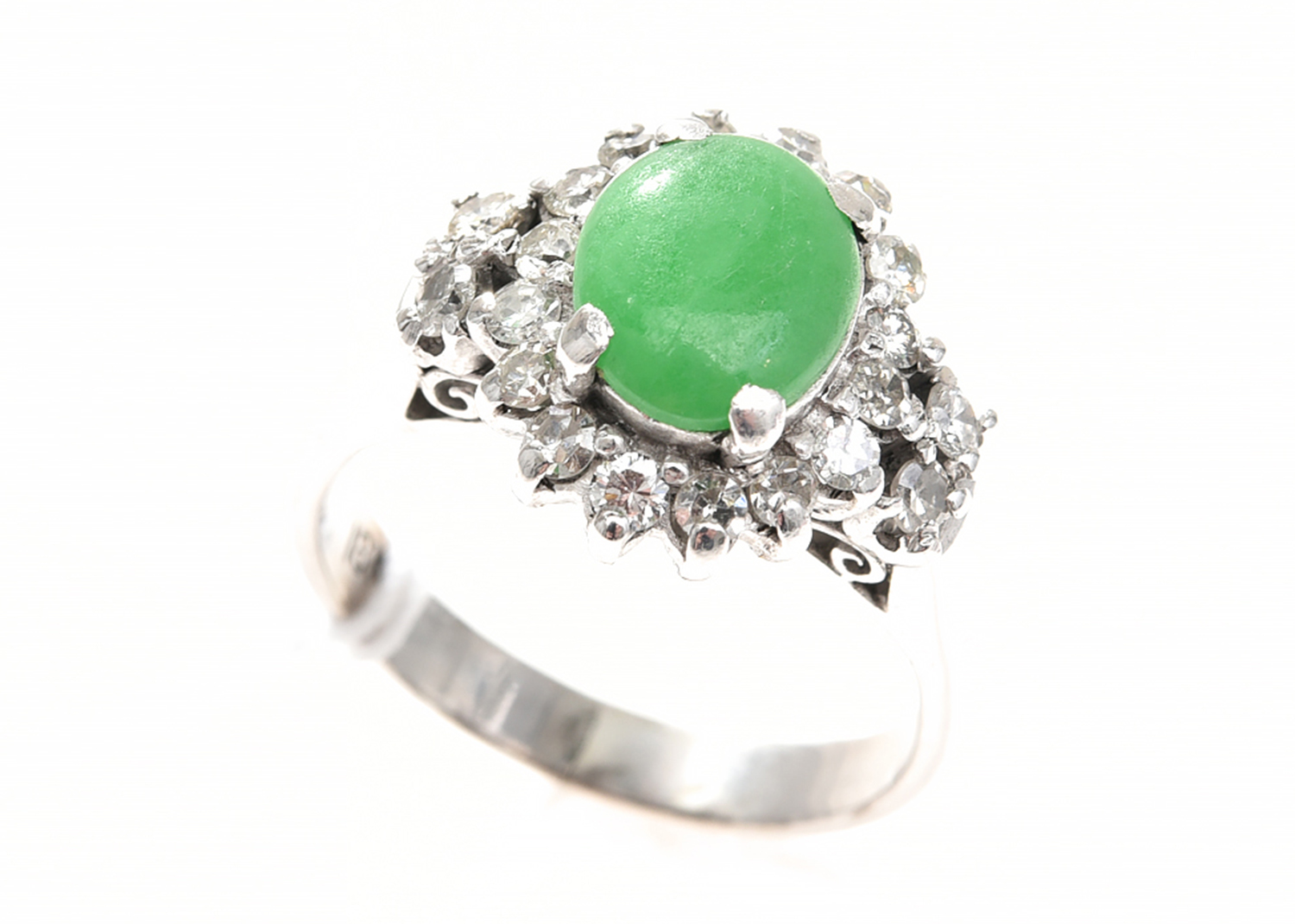 A JADE AND DIAMOND RING IN 18CT WHITE GOLD