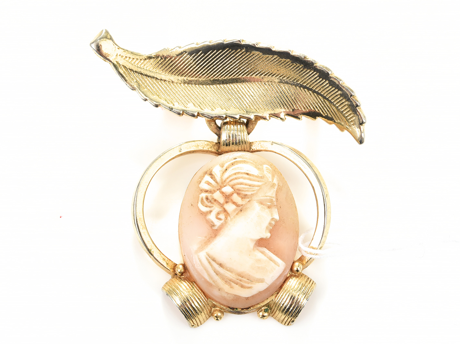 A LEAF BROOCH WITH CAMEO DROP GOLD PLATED