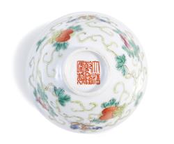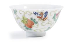 Finely painted in famille rose enamels and gilt with scrolling melons and butterflies, with a six character Qianlong seal mark in iron red to the base.