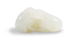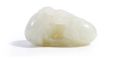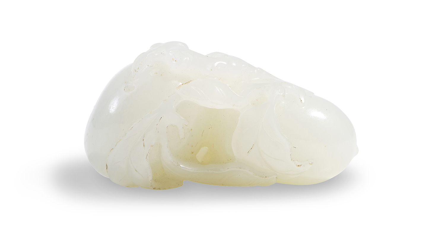 The jade of even pale yellowish white tone, naturalistically carved in the round with two peaches attached to a branch with foliage.